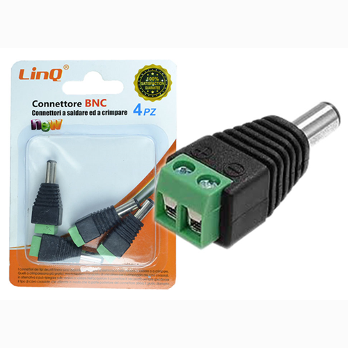 Il sistema a terminale con morsetto polarizzato a serraggio a vite ne consente il montaggio senza nessuna crimpatrice e/o saldatore. Consente di collegare l'alimentazione alle telecamere 12V dotate di presa jack femmina tramite cavo bipolare, basta collegare i 2 fili di alimentazione e il connettore e' pronto per essere collegato alla telecamera. E' composto da una presa di diametro ø interno di 2,1 mm e ø esterno di 5,5 mm e un morsetto a 2 poli a vite montato sul retro con polarità + e - adatto per l'alimentazione della maggior parte delle telecamere per TVCC.