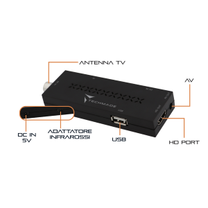 - Audio/Video uscita HD, porta USB 2.0, RF in, IR, AV e DC input
