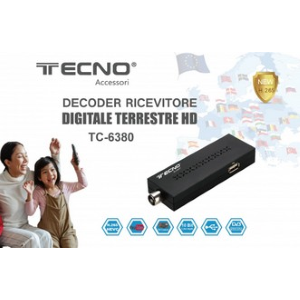 Decoder Digitale Terrestre di nuova generazione TC-6380 MINI DVB-T2 H.265 TECNOACCESSORI® di piccolissime dimensioni (modello STICK) è compatibile con le trasmissioni standard HD DVB-T/T2 H.265 HEVC 10bit e dotato di telecomando universale per controllo decoder e apparecchio TV;