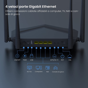 ?Copertura wireless più ampia?le 4 antenne esterne da 5dBi ad alte prestazioni potenziano il segnale Wi-Fi in tutta la casa per una navigazione Internet fluida e stabile. Le tecnologie MU-MIMO e Beamforming garantiscono uno streaming fluido ed una esperienza di gioco sempre al top.