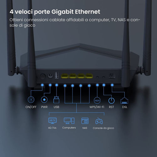 ?4 porte Ethernet Gigabit? con 4 porte LAN funzionanti a 1 Gb/s, puoi usufruire di servizi DSL ad alta velocità e applicazioni multimediali ad alta intensità di banda come TV HD, computer, servizio NAS e console di gioco in modo molto più semplice e veloce che mai.