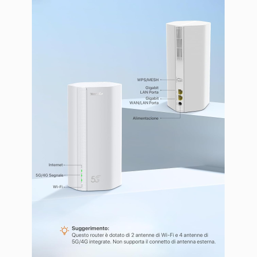 Modem Router 5G con porte Gigabit Ethernet: ideale per connessioni cablate ad alta velocità con PC, console da gaming, IPTV e telecamere di sorveglianza. Nota: non compatibile con connessioni DSL né con modalità bridge.
