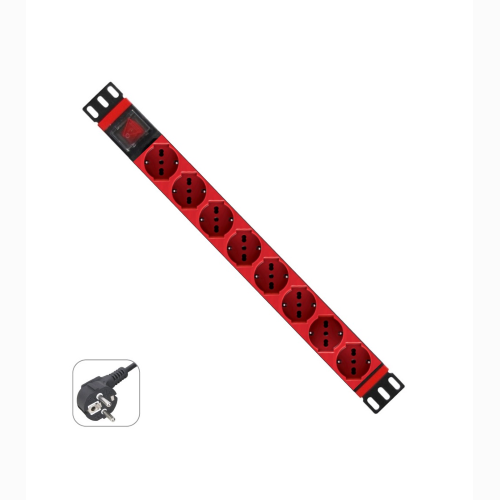 Multipresa rack 19" con 8 prese universali rosse Italiane/Schuko (10/16A) ruotate a 45 gradi e interruttore luminoso.