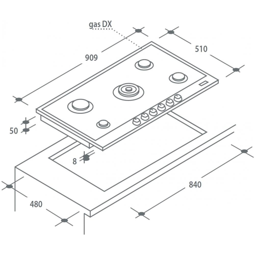 Materiale del piano Inox plate. Elettromagnetica per ciascun bruciatore. Dimensioni del prodotto 909 x 510 x 50 mm.