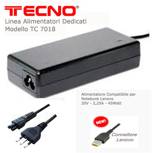 ALIMENTATORE COMPATIBILE PER NOTEBOOK LENOVO 45W 20V 2,25A PLUG RETTANGOLARE TECNO 7018